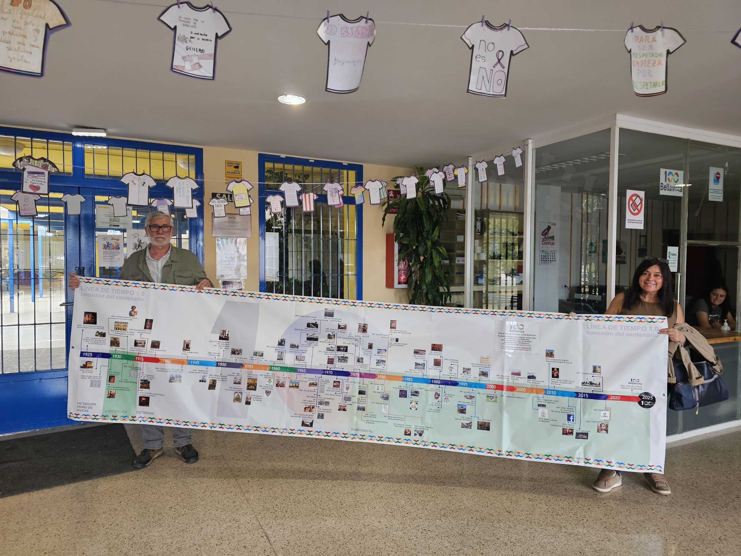 En el interior del instituto se ha instalado una línea del tiempo que recoge los hitos más importantes de Bellavista, desde sus orígenes hasta la actualidad. Esta exposición pretende que los alumnos, profesorado y visitantes puedan conocer la evolución de la barriada, su crecimiento urbano, y los acontecimientos que marcaron su identidad a lo largo de los últimos cien años.